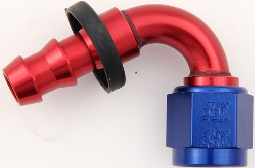 Fitting - Hose End - Push-On - 120 Degree - 6 AN Hose Barb to 6 AN Female - Aluminum - Red/Blue Anodize - Each